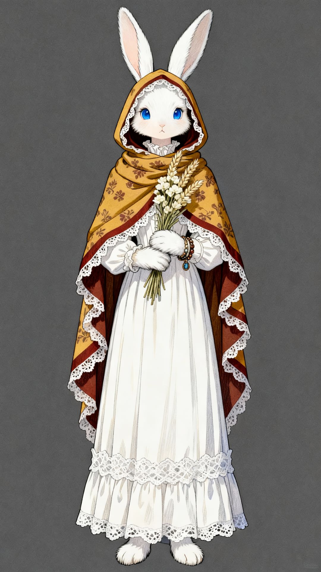 对于她的喜好除了经典的喜好阅读,安静外额外添加了喜爱缝纫的设定,月露擅长缝纫尤其是各种蕾丝花边的制作,她的服饰也是由此延申出是米白的长裙,加上她自己缝上的白色的蕾丝花边,这样的设计令人一看便知是喜爱缝纫的角色,白色的长裙搭配她雪白的毛发或许有些单调,所以又加上了自然的颜色——土黄色的同样带着蕾丝花边的斗篷,她长长的耳朵也可以从帽子里面伸出来,显得她更加可爱。