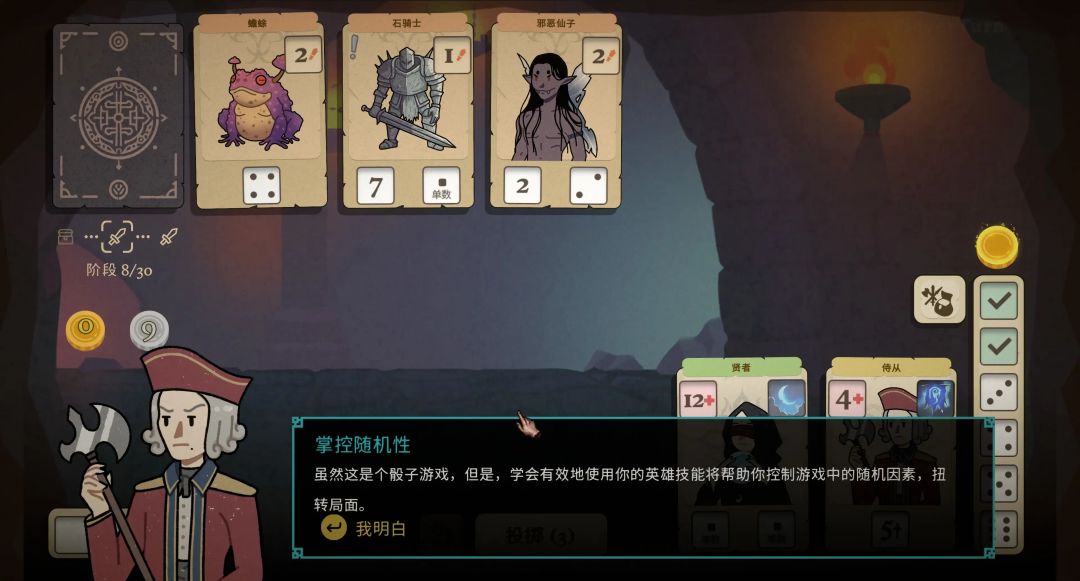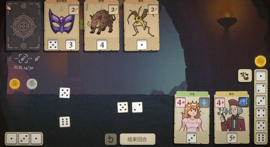本作的难度在我看来还是很大的,因为前期除了我最喜欢的侍从角色,另外的角色容错率实在是低,但凡你要脸黑点,可能三五个回合都roll不出你想要的点数,那就很难受了,我建议前期多积攒金币和骰子,遇到伤害低的可以挨两下拿拿钱、遇到伤害高的那就优先解决~