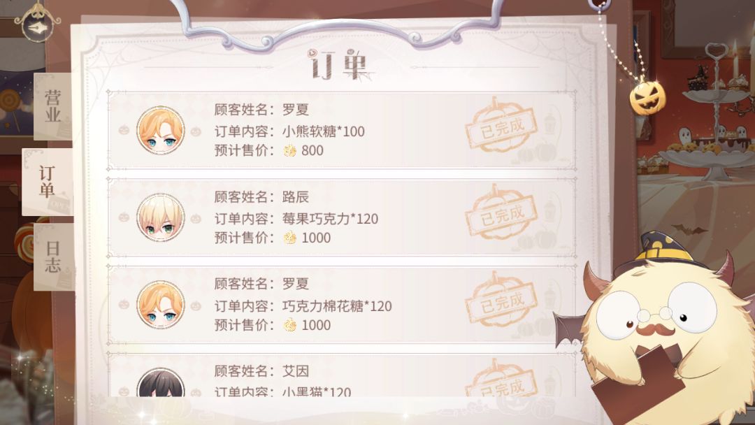 我现在做完了这个活动,营业额继续飙升,订单也时不时出来800,1000,就连小概率事件的日志都开始冒头,为了彩券就连男主们的亲密度都爆表了,之后就可以把体力分给主线和练习了吧,万圣再稍微打几次就没问题了,现在要做的就是边打副本边等奖励
