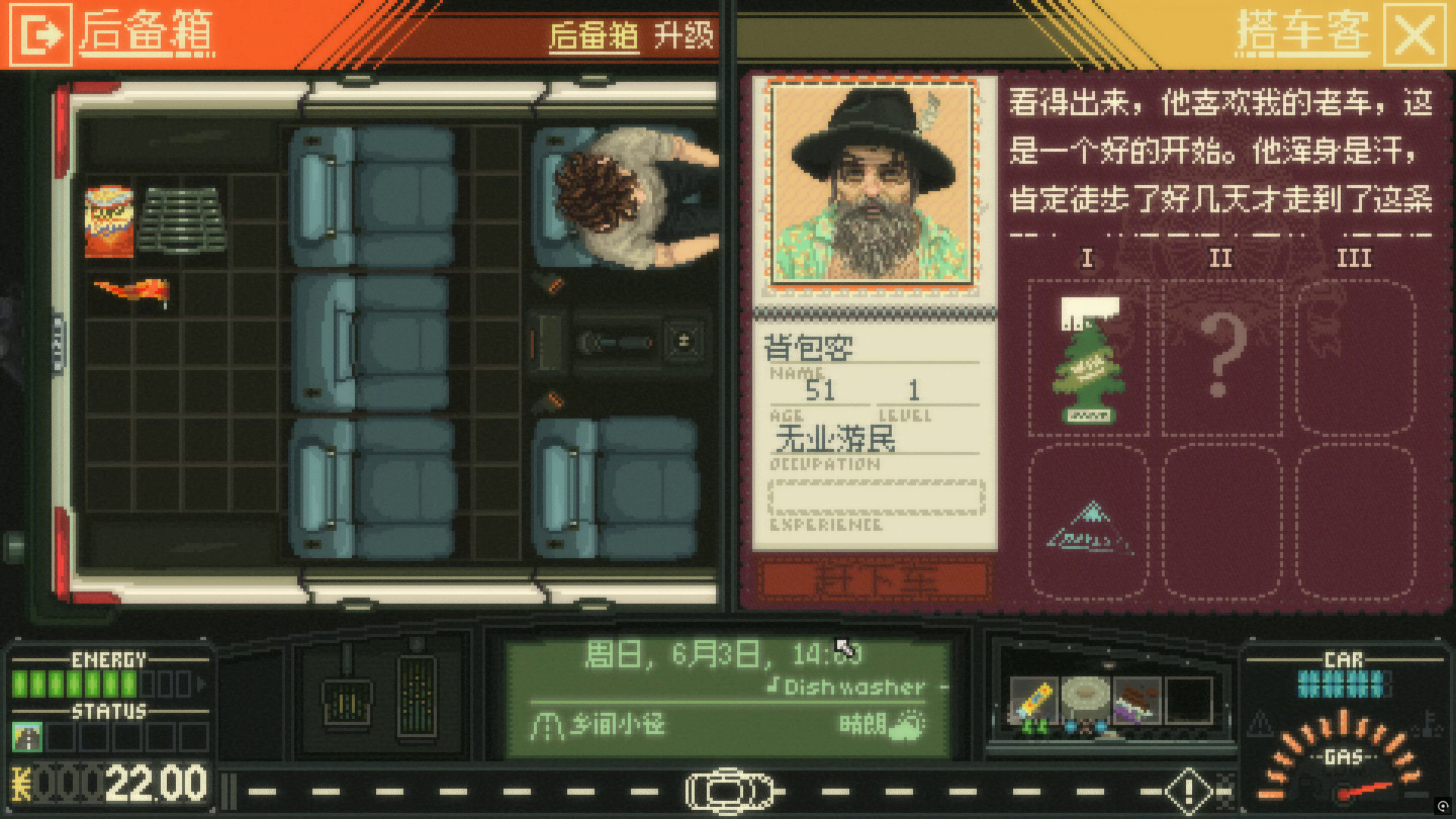 游戏的大部分时间里我们都是与爱车相伴,一边在公路上行驶,一边思考人生的意义。在这趟说走就走的旅途中,我们会遇到形形色色的搭车客,有时候是半路抛锚的修理工,有时候是逃婚的准新娘,有时候是从国外来旅游的情侣……搭车客也成为了这款游戏的灵魂,并非每个人在上车前都有明确的目的地,有的人只是不想留在原地,随着旅行的开始,他们也许会逐渐找到自己的目标,而我们更像是引路人的身份,在帮助他人的同时也在寻找那份属于自己的人生意义。