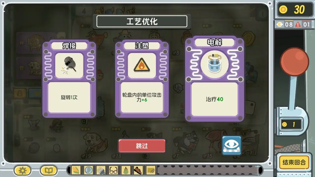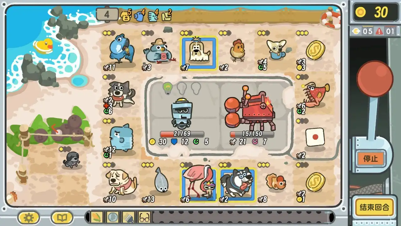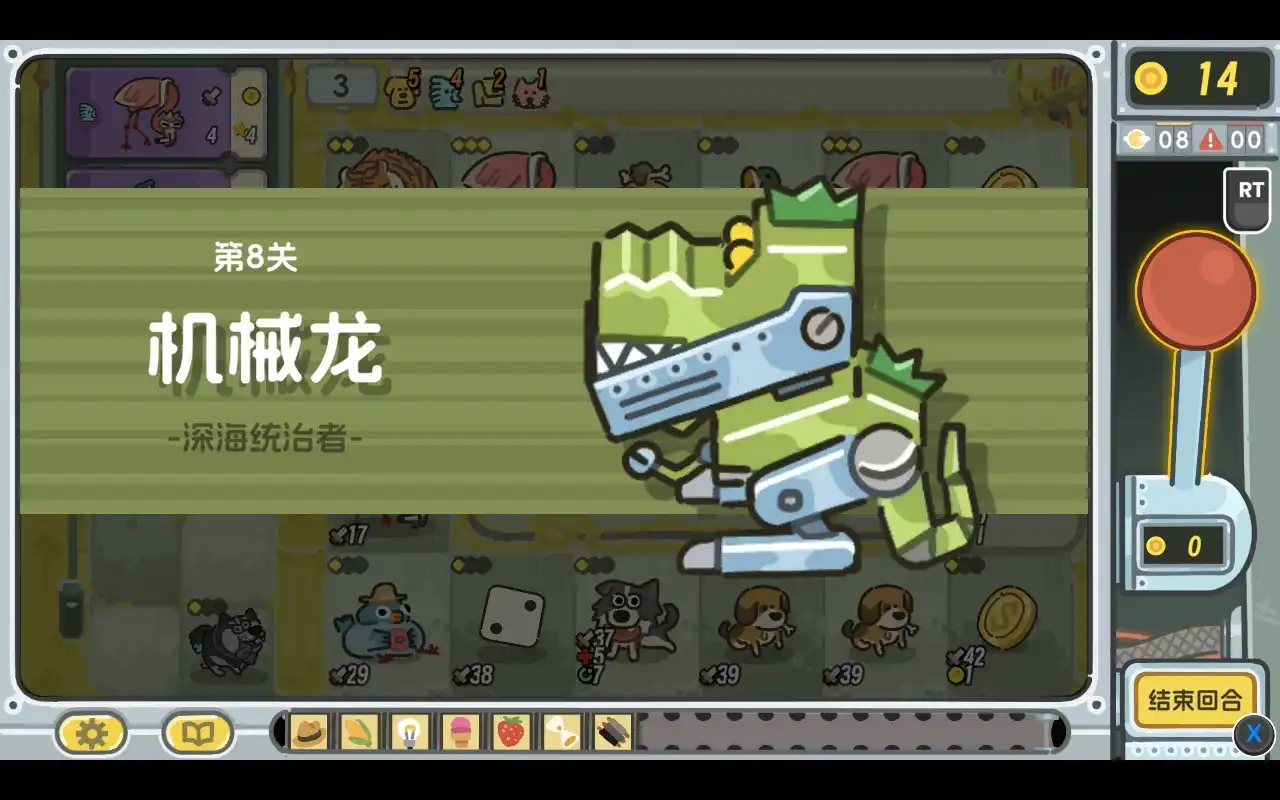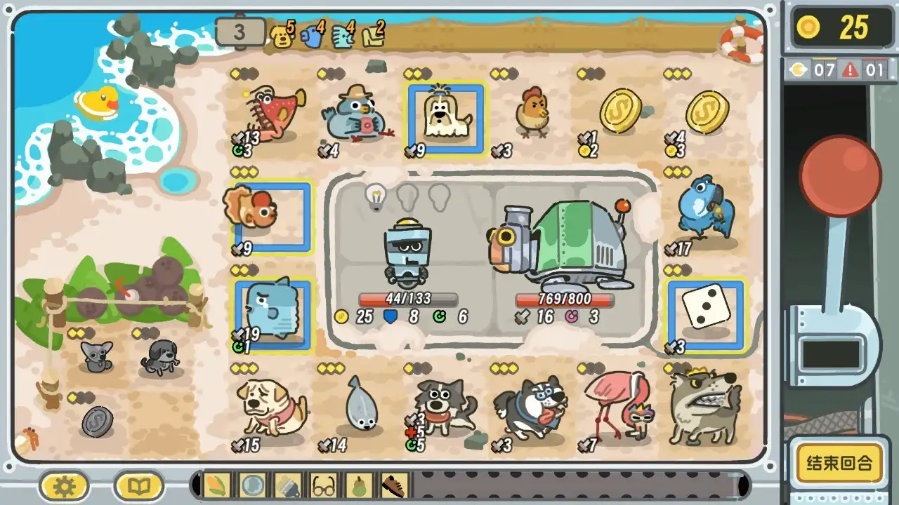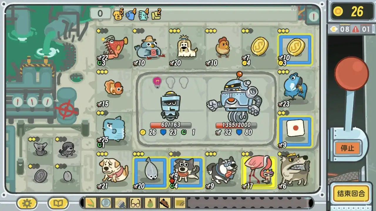 玩法上简单来说就是选取每回合商店中随机刷新出的动物、道具摆放在轮盘上,然后拉动操作杆,停留到的格子就产生包括攻击等的相应效果。不过有两个地方需要注意:一是初期轮盘上很多地块是锁定的,需要随着回合推进而逐渐解锁;二是玩家单回合可以进行多次拉杆,虽然每次拉杆多少能产生些收益或者发动攻击,但是花费的金币也会随着拉杆次数的增加而升高,这就需要玩家进行权衡。
