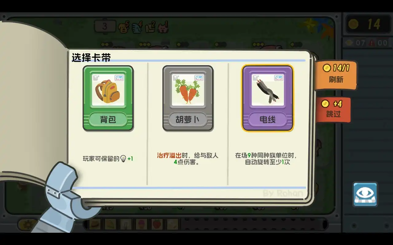 而游戏中的卡带则类似于“遗物”机制,经典品质区分+三选一,主要是配合不同流派的动物进行增益,当然也有不少是直接作用于轮盘或者是主角的。