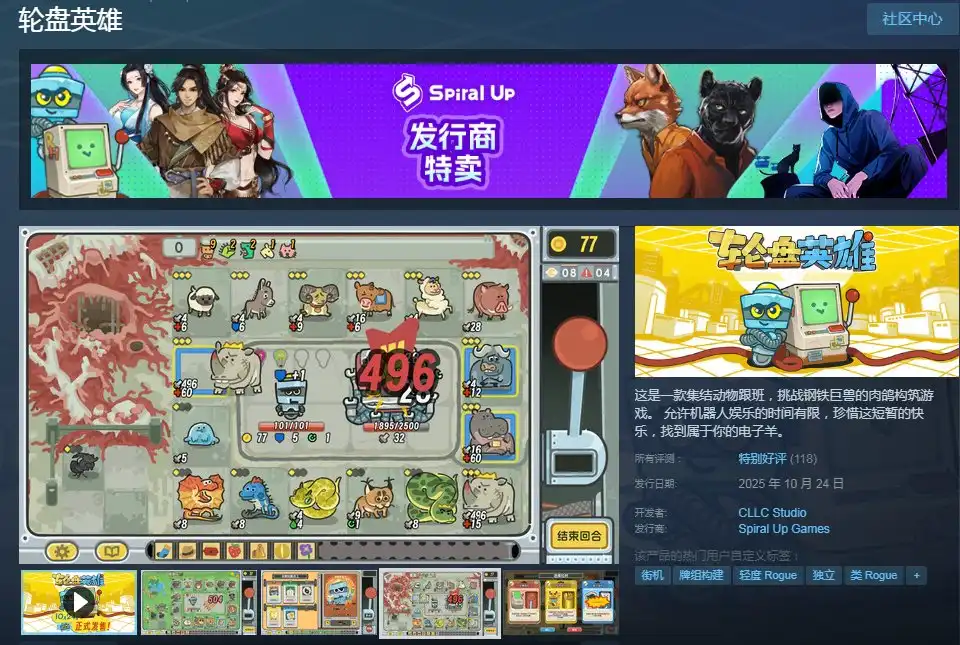 《轮盘英雄》是一款机制简单但玩起来却意外上头的类老虎机游戏。玩家控制有着不同能力的小机器人,在一张不大的棋盘上布置各种动物或是道具,在通过拉杆的形式对敌人进行攻击。由于棋盘格子受限,游戏非常考验玩家的流派构筑策略,尤其是某些BOSS有着自身独特的机制,需要长线备战。此外游戏也通过随机商店刷新、三选一卡带以及工艺奖励带来了不错的肉鸽元素。总体上属于上手简单但其实也有不错深度的休闲游戏。