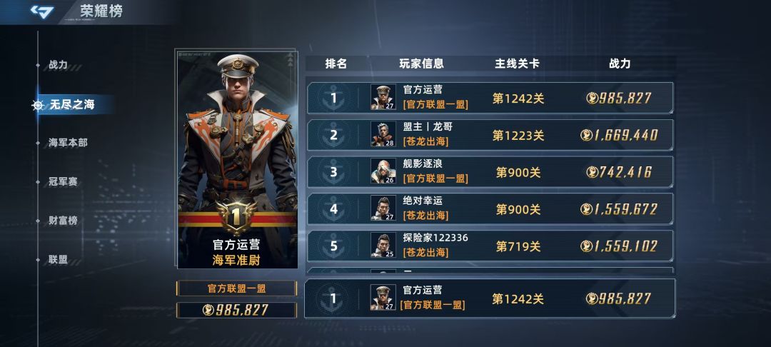 官方联盟一盟联盟凭借其标志性的“自爆卡车流”(四潜艇一航母),在前期展现了恐怖的开荒速度与爆发力。他们以集团化作战的方式,利用潜艇的隐匿特性,在对手反潜体系尚未建立的真空期,以低战力的姿态占据主线排行榜榜首。