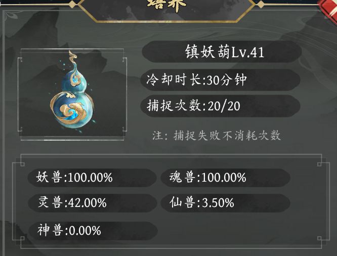 目前我葫芦只有41级,是有概率抓仙兽,前提是我境界达不到,进入不了仙兽地图,所以玩家前期不用提前升级葫芦等级,跟随境界走就可以。