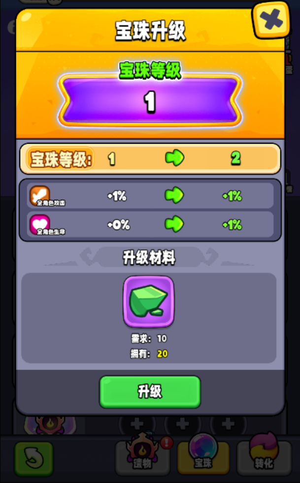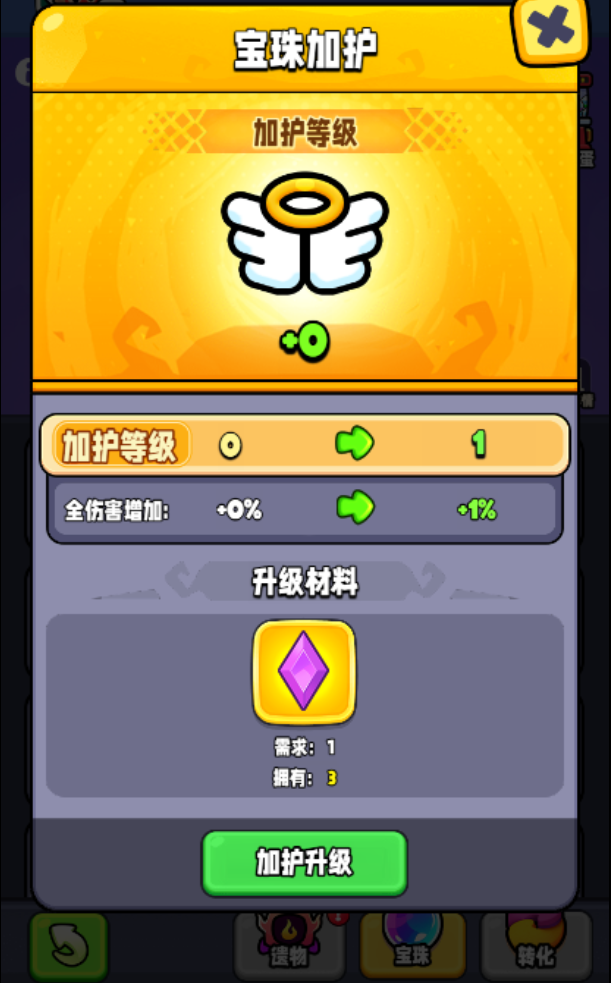 5、使用宝珠碎片可以提升宝珠等级,宝珠等级越高,全角色攻击/生命的属性值将更加高;使用宝珠晶核可提升宝珠加护等级,宝珠加护等级越高,全伤害增加的属性值越高;