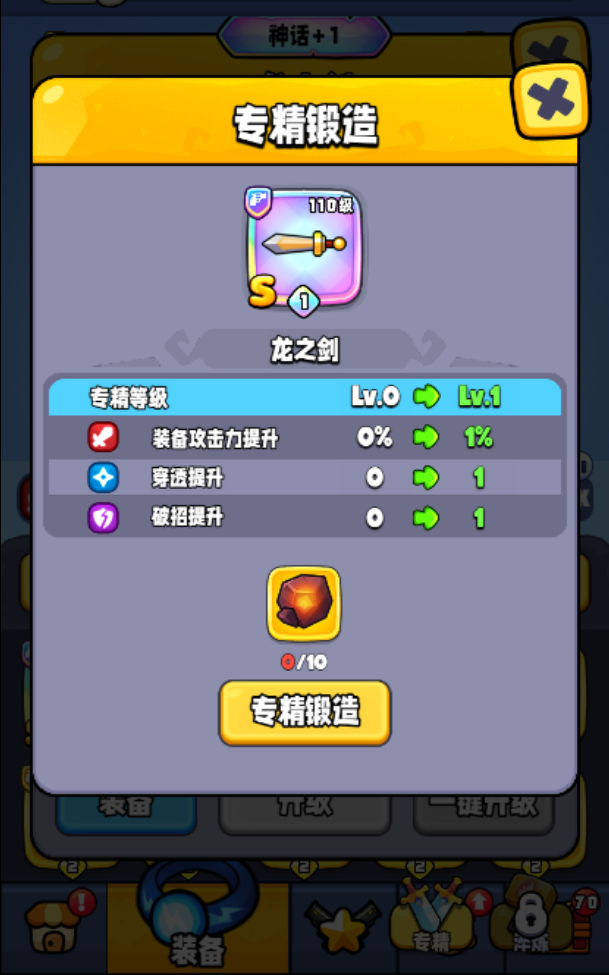 2、使用专精石可以进行专精锻造,一定等级后将会需要消耗同部位的传说品阶装备,专精等级越高,专精属性越好;