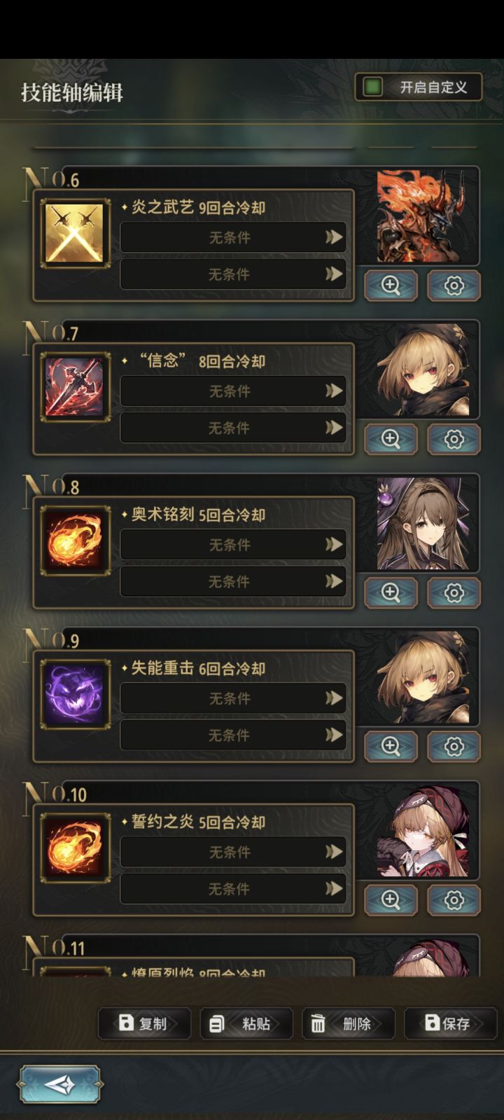 注意:每次编队如果有人物变动,主角职业变动,魔物变动都需要去更改技能轴(确实很麻烦)对此希望在技能轴页面也加几个预设技能轴