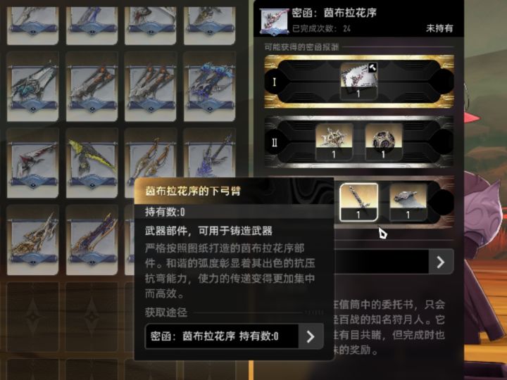 武器密函爆率那叫一个高啊,五次周本加首通一共24个,但是,但是,但是,我下弓臂呢???全是弓弦跟上弓臂,我下弓臂去哪了???忙活了大半天还是一个花弓造不出来,满命夫人痛失专武