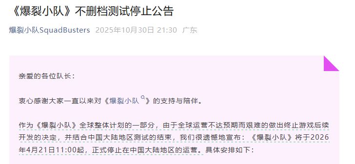 不过《爆裂小队》国服更加直白,官宣将于明年4月21日起,停止大陆地区的运营。