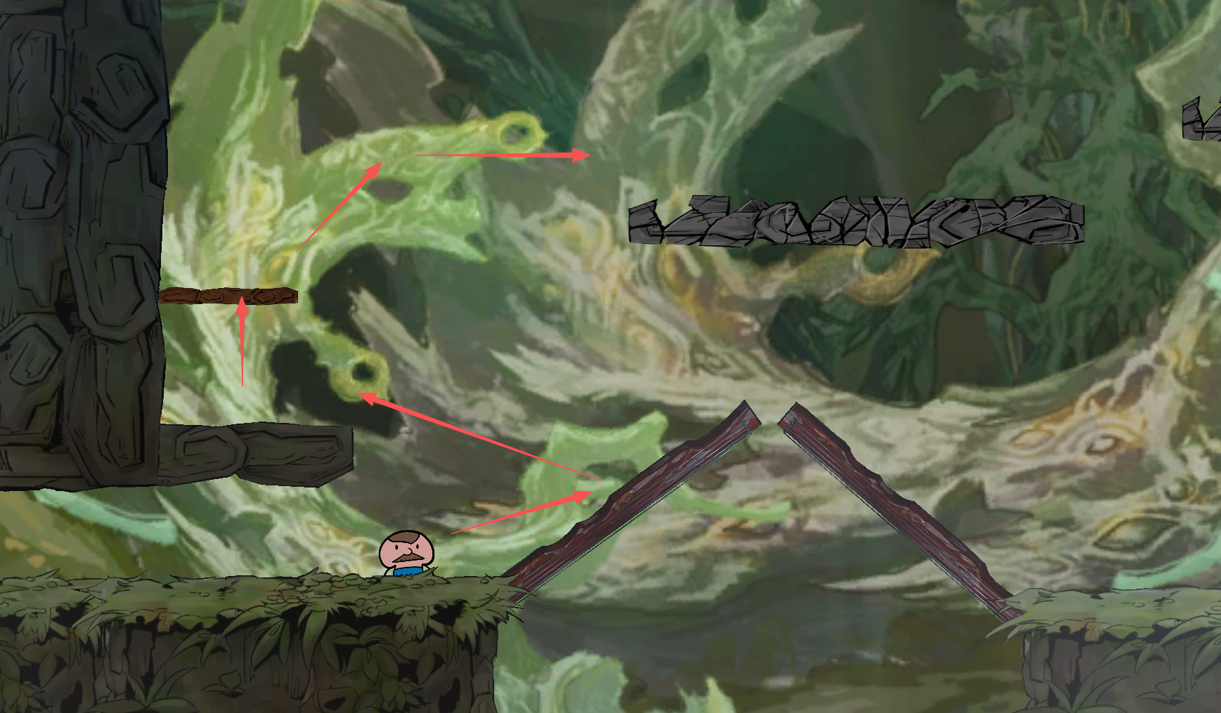这里先被弹起后回到左边的小平台上,然后使用 跳+冲刺,踏上易碎平台~