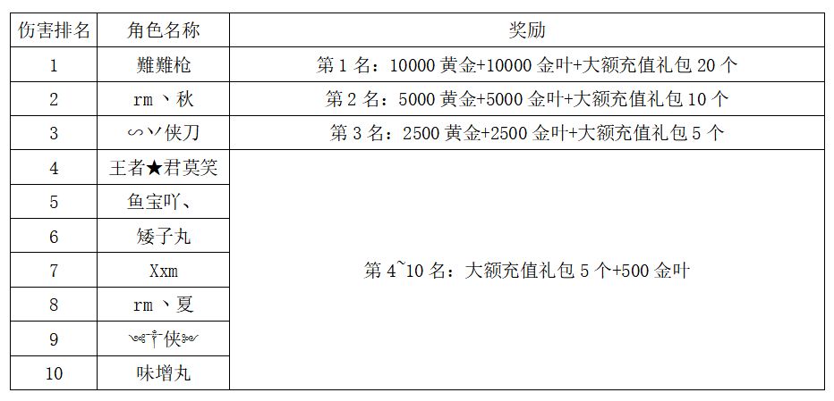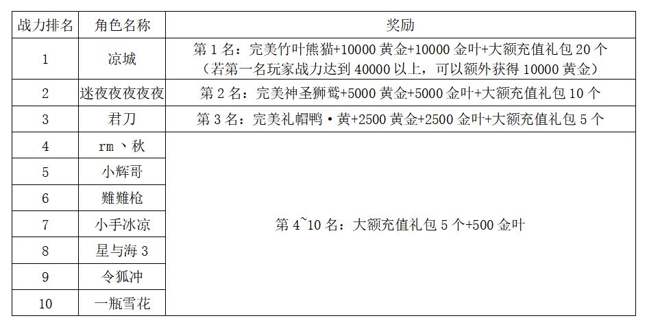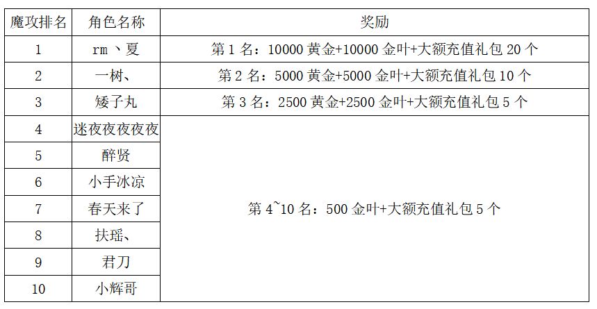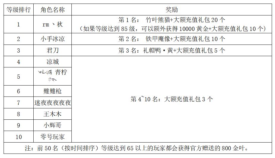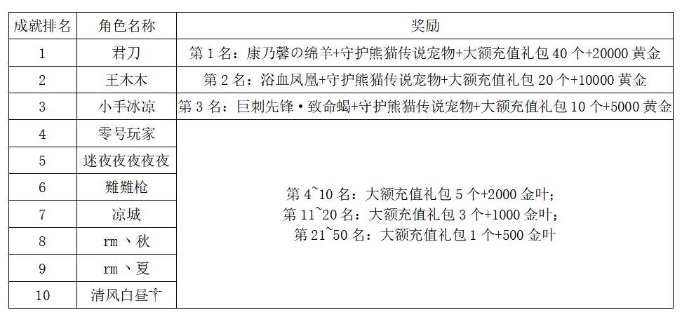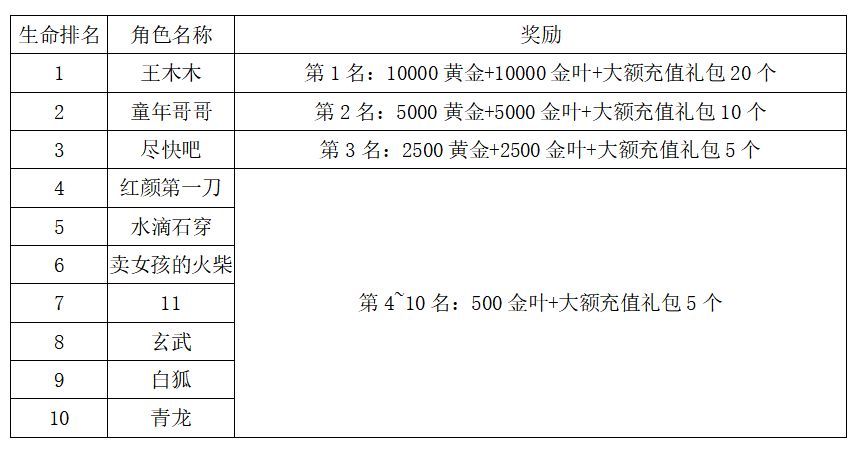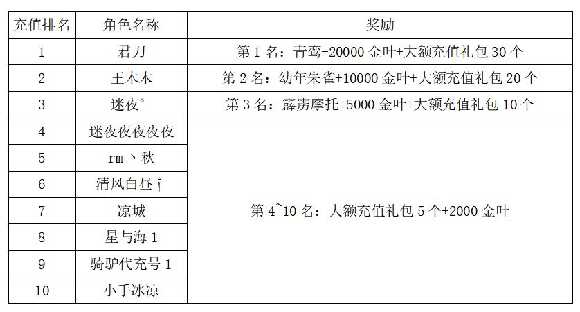 注:以上活动排名均以服务器时间为准。新区排行榜活动如发现存在违反游戏相关规定使用游戏外的辅助工具进行作弊将取消获奖资格。