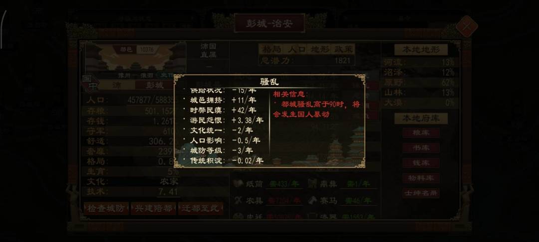 划郡以后,郡治和郡郊会增加人口上限,论坛里很多玩家秀人口大城就是州郡规划出来的郡治。而时弊民瘼随着城市人口的增加而增加,最终使每年城邑骚乱增加到恐怖的数值。
