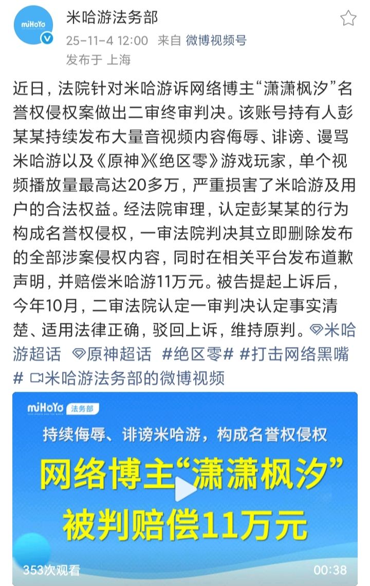 米哈游告“潇潇枫汐”胜诉❗up主赔了11万🔥