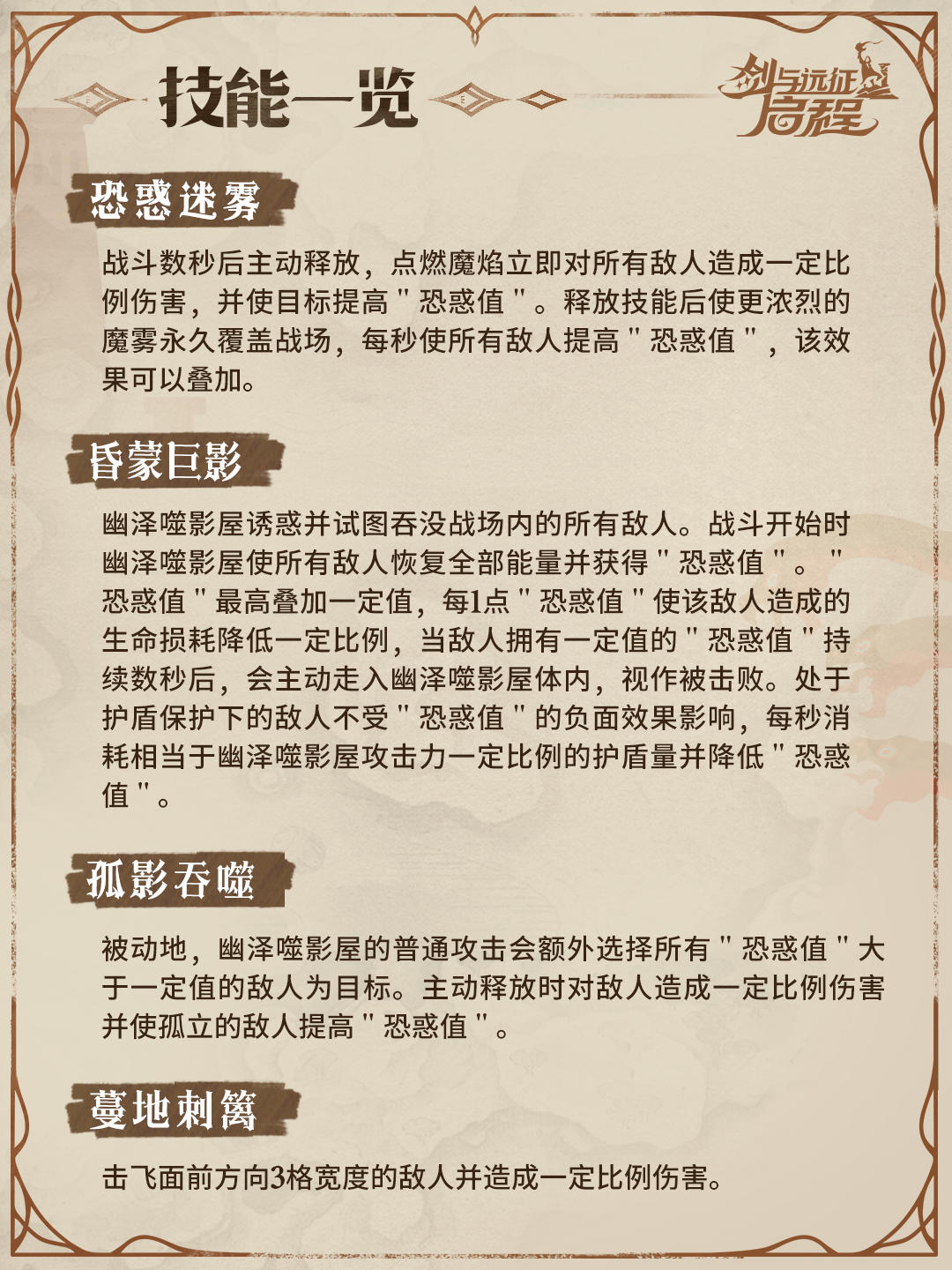 幽泽噬影屋会给敌人附加“恐惑值”状态。拥有“恐惑值”的敌人对幽泽噬影屋造成的生命损耗将会降低,当敌人拥有一定值的“恐惑值”后,会主动走入幽泽噬影屋体内,视作被击败。