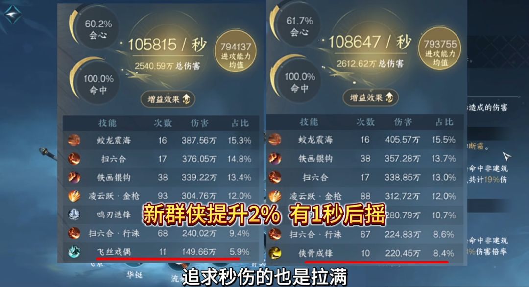 “【侠骨成锋】在关山飞鸿赛季有20%的赛季增伤,满阶情况下对比老群侠【飞丝戏偶】大概有2%左右输出提升(1500~2000秒伤左右),木桩环境下是稳提升的。”——来自玩家@有小栖
