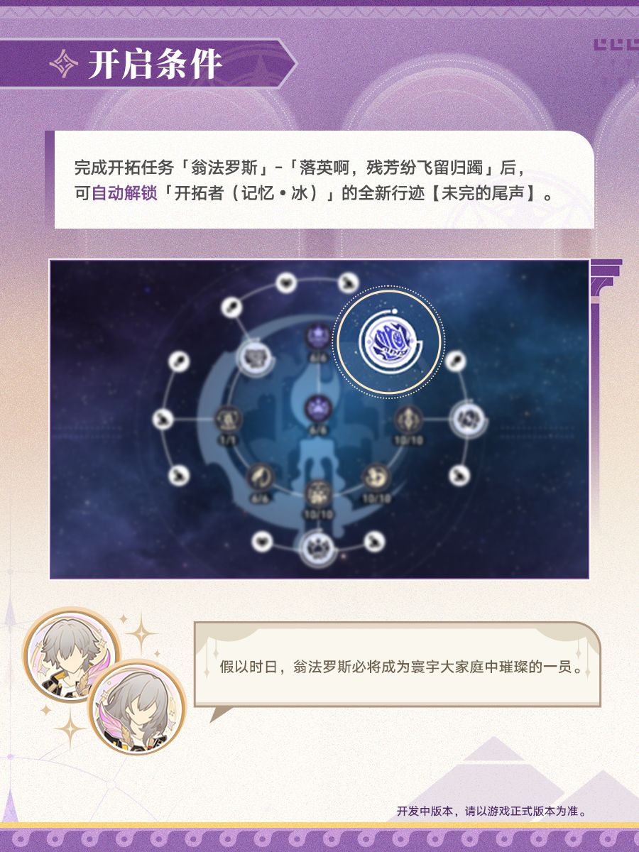 ※3.7版本更新后,完成开拓任务「翁法罗斯」-「落英啊,残芳纷飞留归躅」,可自动解锁「开拓者(记忆•冰)」的全新行迹【未完的尾声】。
