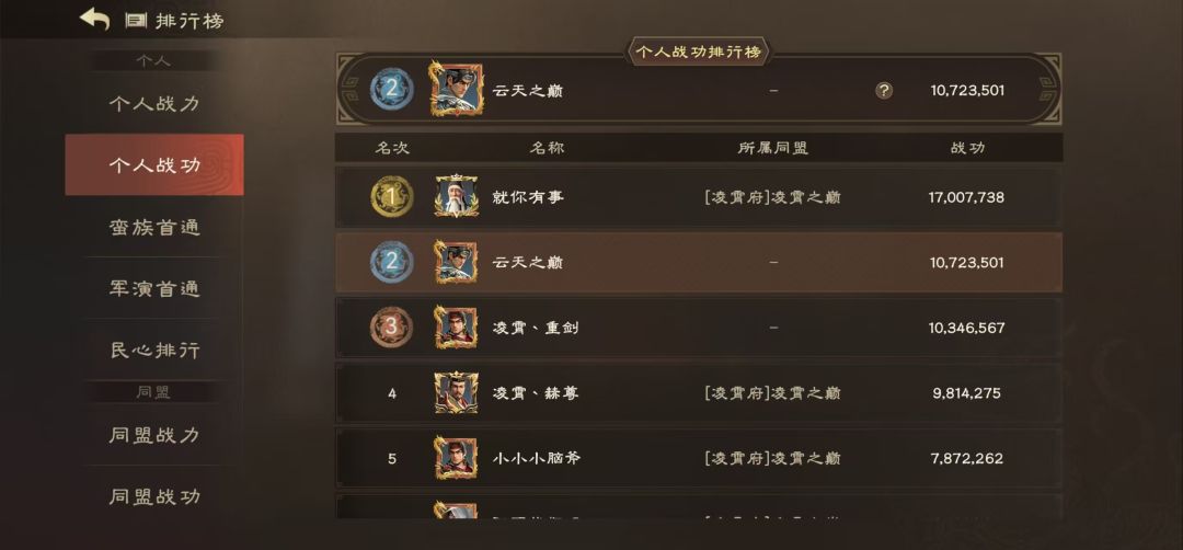 看到这位主公战绩辉煌的PVP排行界面与10克黄金的照片,从排行榜上可观的战功和战力数值不难看出,这是一位实力强劲的核心玩家,黄金大奖可谓实至名归!