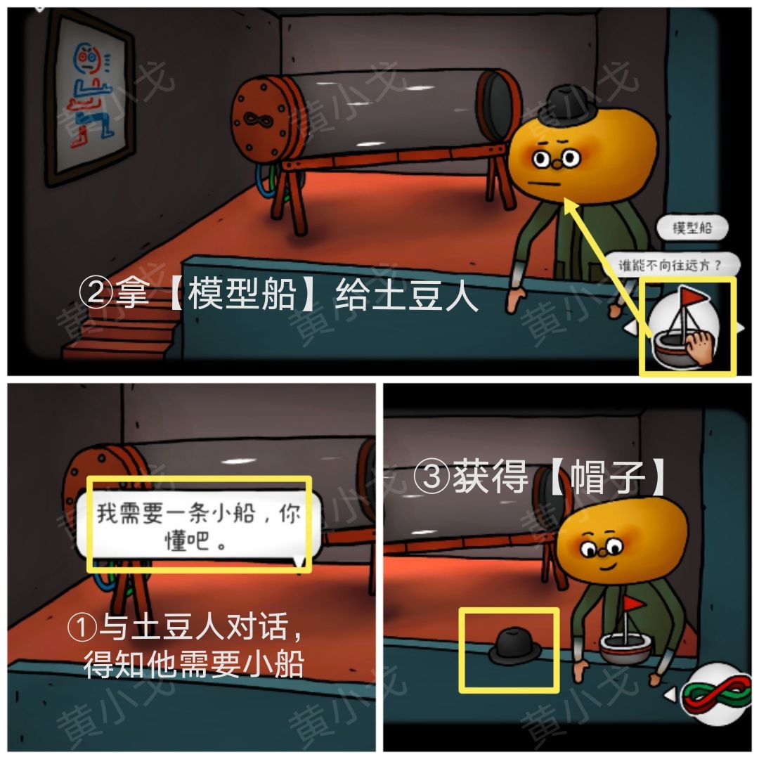 27.与土豆人对话,得知他需要小船;拿【模型船】给他,获得【帽子】