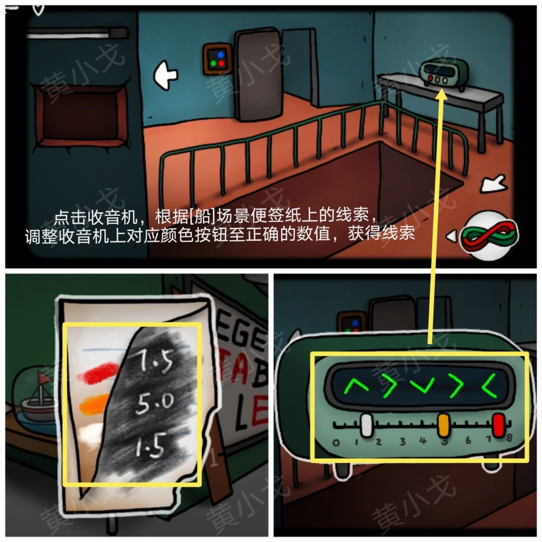 26.点击收音机,根据[船]场景便签纸上的线索,调整收音机上对应颜色按钮至正确的数值,获得线索