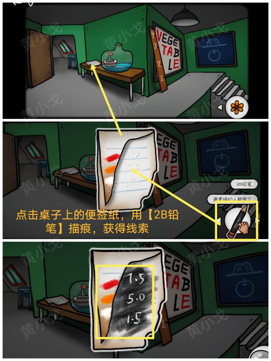 10.点击桌子上的便签纸,用【2B铅笔】描痕,获得线索