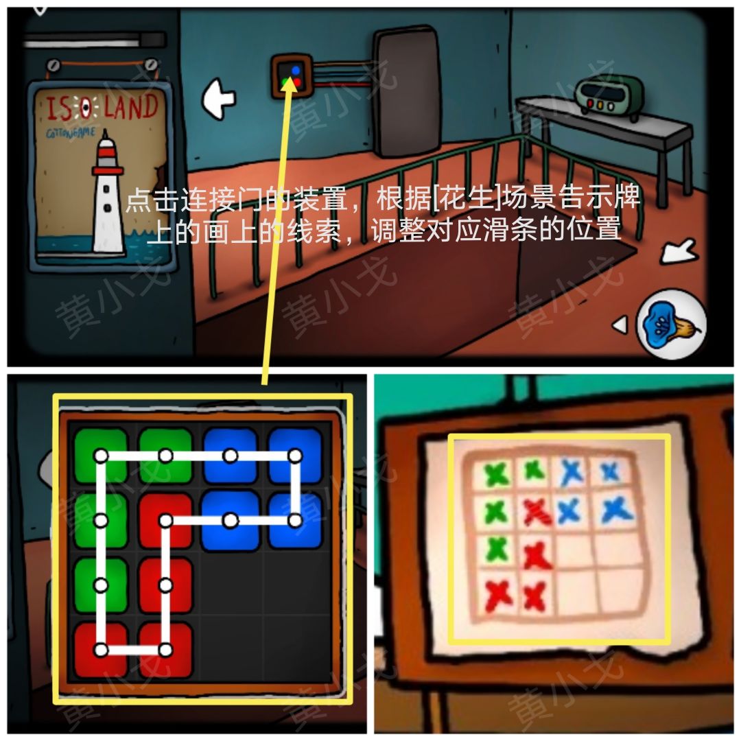 2.点击连接门的装置,根据[花生]场景告示牌上的画上的线索,调整对应颜色滑条的位置,打开门