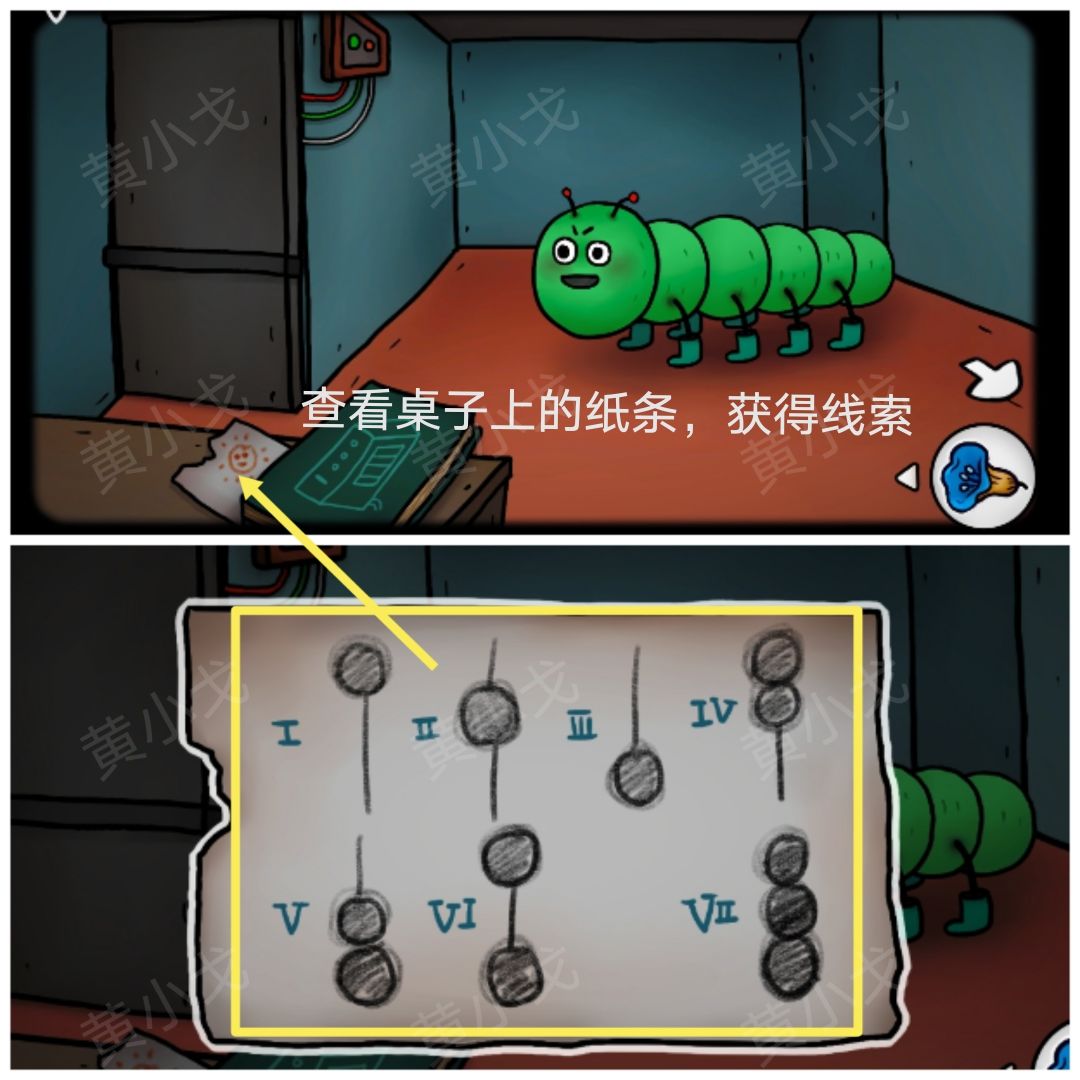 22.点击装置上的密码锁,根据上面的罗马数字提示,结合[大青虫]场景纸条上的线索,调整密码锁