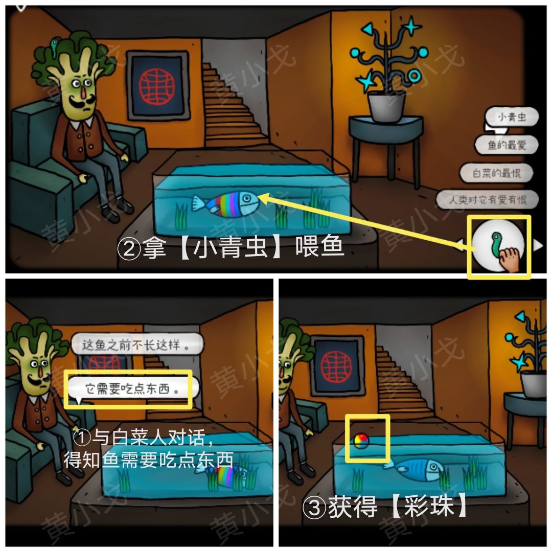 13.与白菜人对话,得知鱼需要吃点东西;拿【小青虫】喂鱼,获得【彩珠】