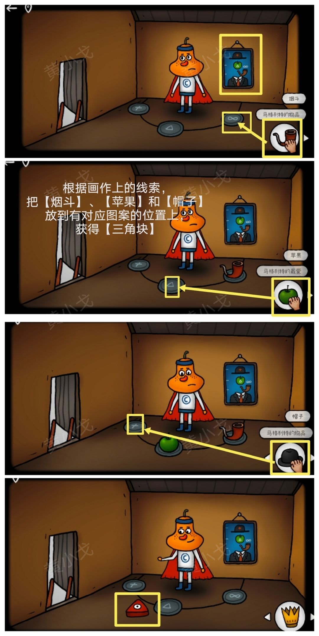36.根据画作上的线索,把【烟斗】、【苹果】和【帽子】放到有对应图案的位置上,获得【三角块】