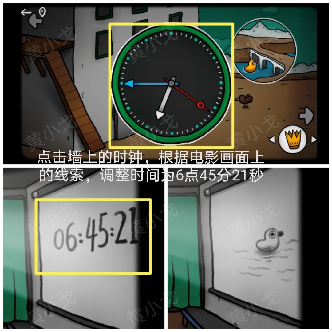 18.点击墙上的时钟,根据电影画面上的线索,调整时间为6点45分21秒