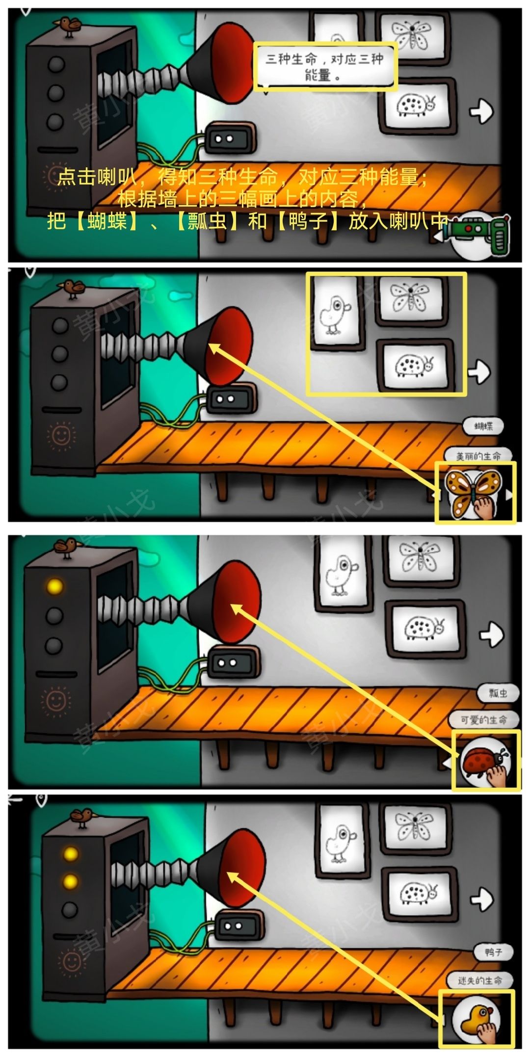 23.点击喇叭,得知三种生命,对应三种能量;根据墙上的三幅画上的内容,把【蝴蝶】、【瓢虫】和【鸭子】放入喇叭中