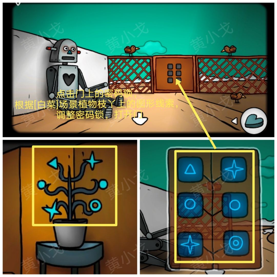 37.点击门上的密码锁,根据[白菜]场景植物枝丫上的图形线索,调整密码锁,打开门