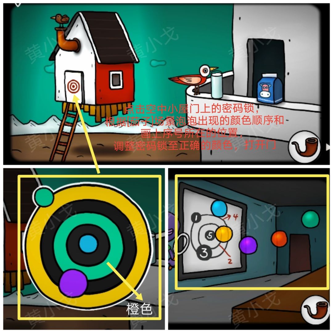 34.点击空中小屋门上的密码锁,根据[茄子]场景泡泡出现的颜色顺序和画上序号所在的位置,调整密码锁至正确的颜色,打开门