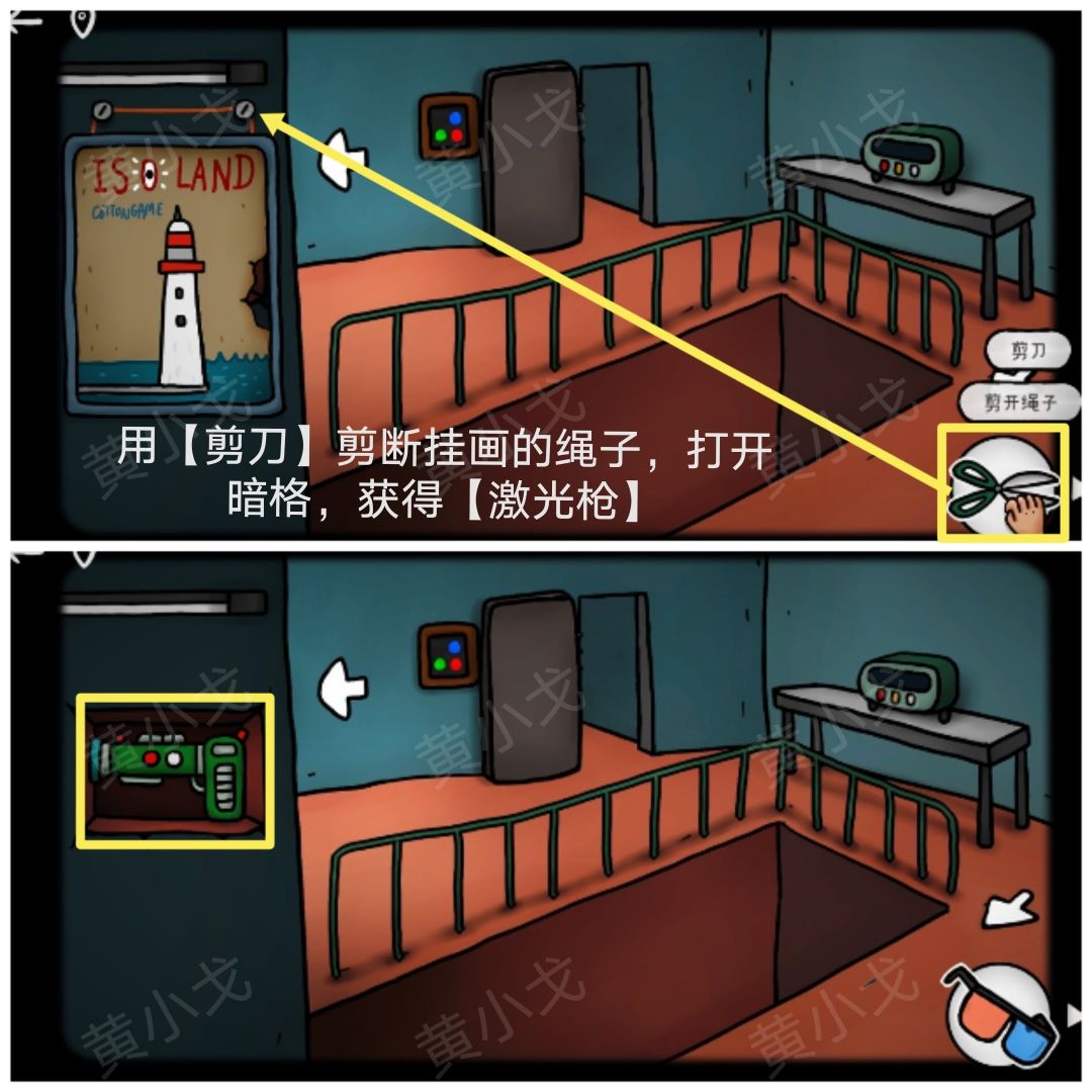 3.用【剪刀】剪断挂画的绳子,打开暗格,获得【激光枪】
