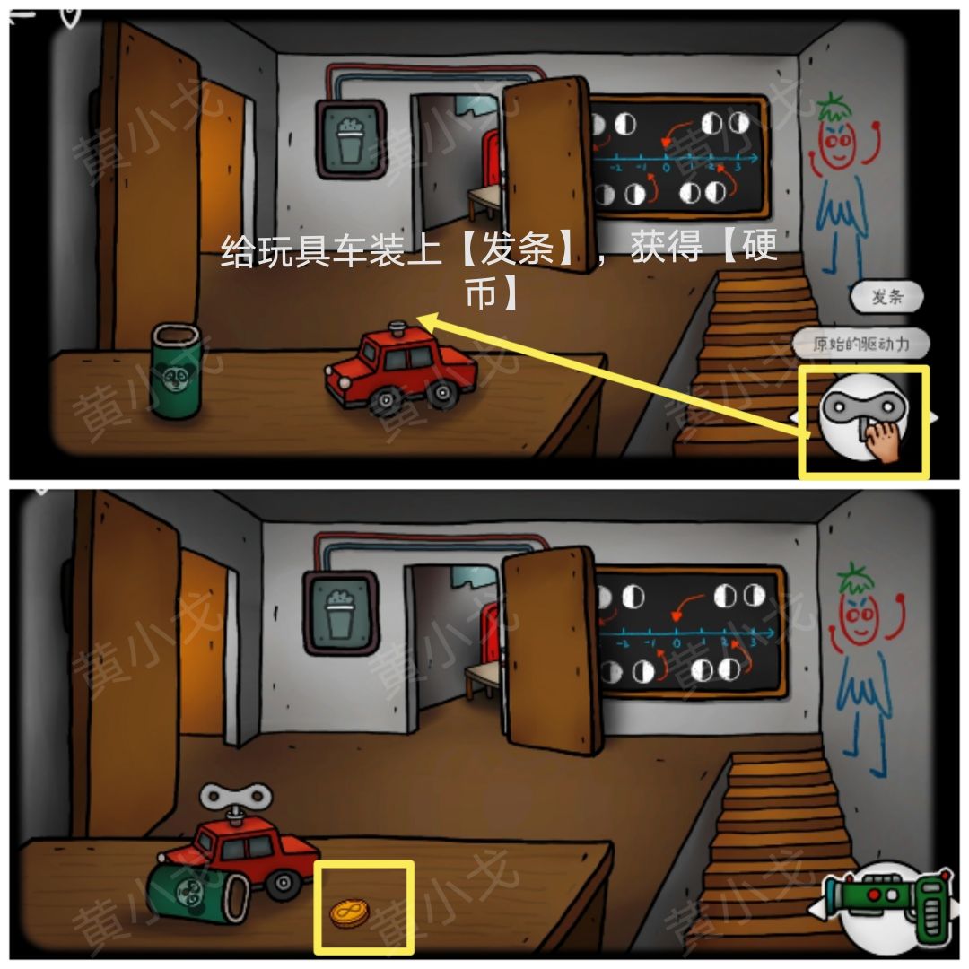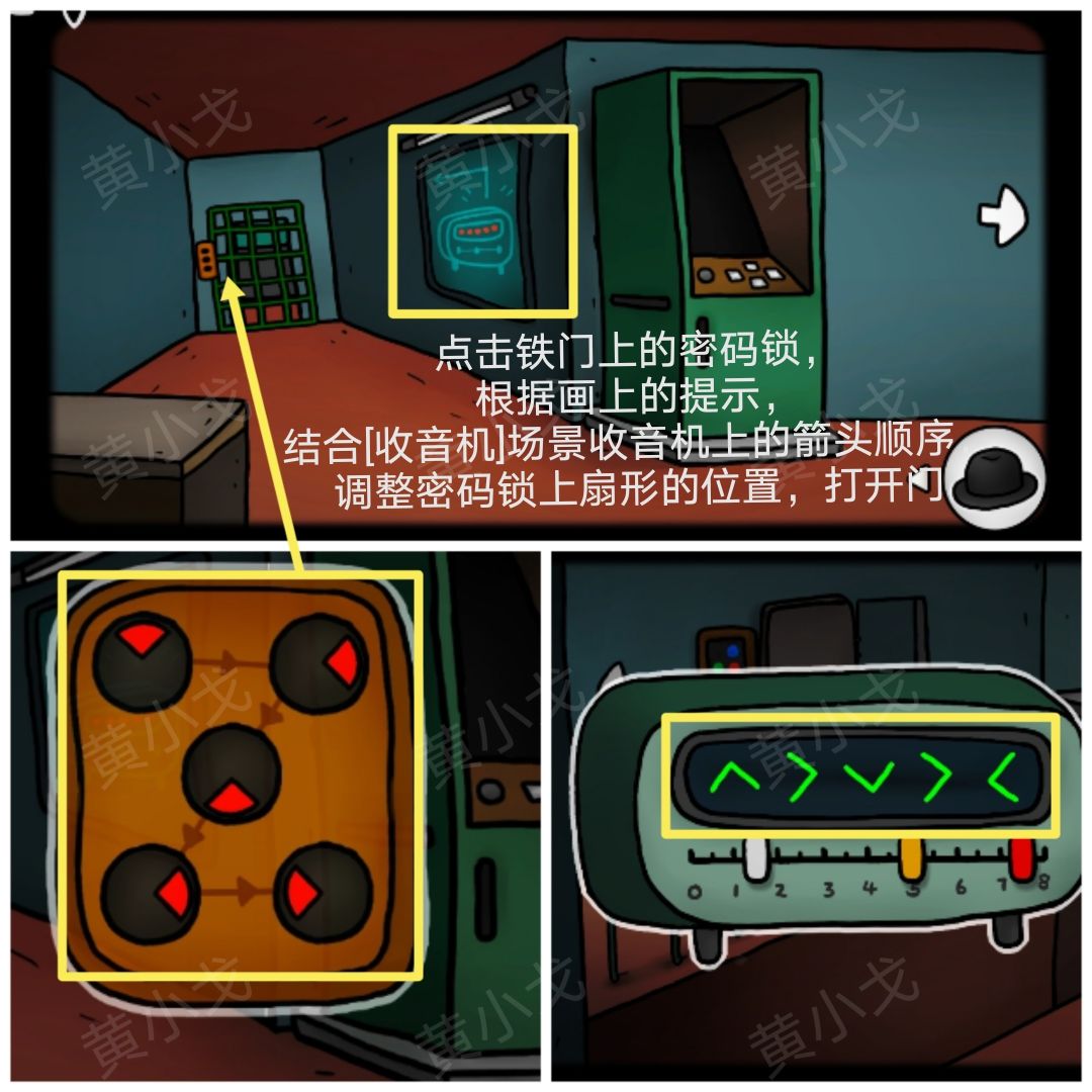 31.点击铁门上的密码锁,根据画上的提示,结合[收音机]场景收音机上的箭头顺序,调整密码锁上扇形的位置,打开门