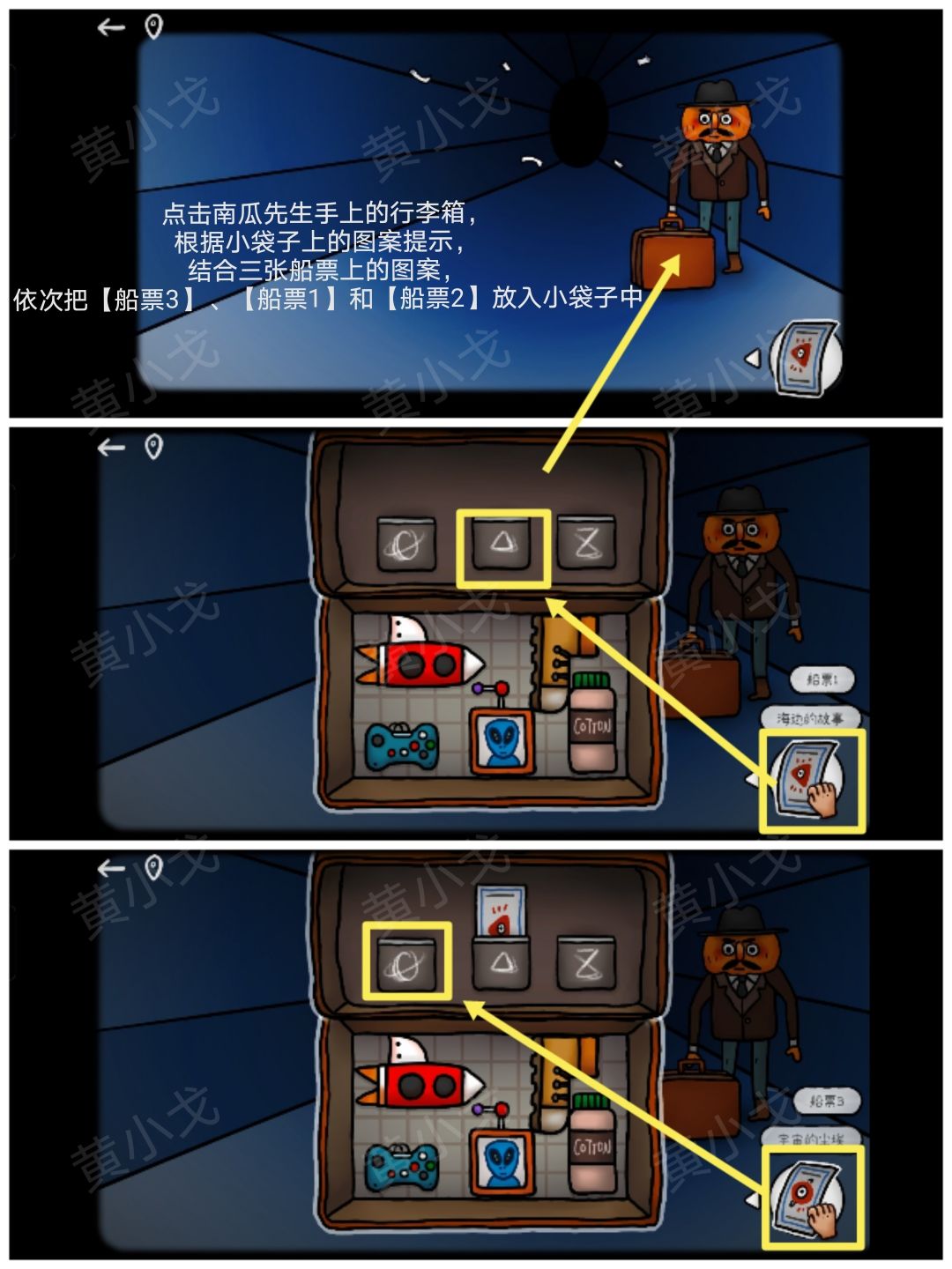 40.点击南瓜先生手上的行李箱,根据小袋子上的图案提示,结合三张船票上的图案,依次把【船票3】、【船票1】和【船票2】放入小袋子中;完成收纳小游戏