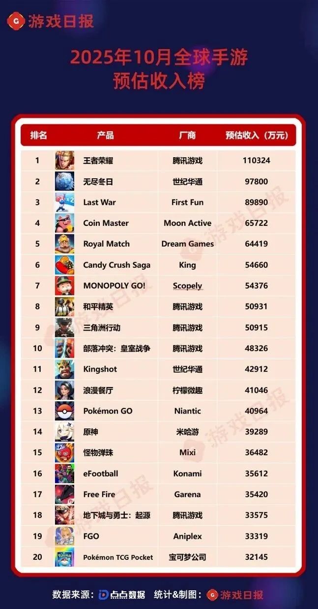 十月全球手游收入榜出炉,王者荣耀占领榜首