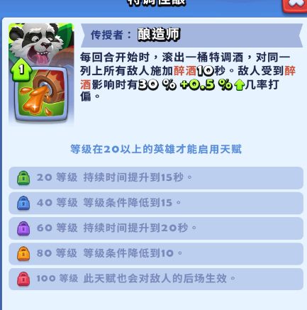 天赋---特调佳酿,每回合开始时,滚出一桶特调酒,对同一列上所有敌人施加醉酒10秒。敌人受到醉酒影响时有30%+0.5%几率打偏。每次天赋提升都能增加控制时长,让敌方受到控制更加严重。达到满级时对敌方后场敌人也会生效的哦,大大降低了对方后排的输出空间。