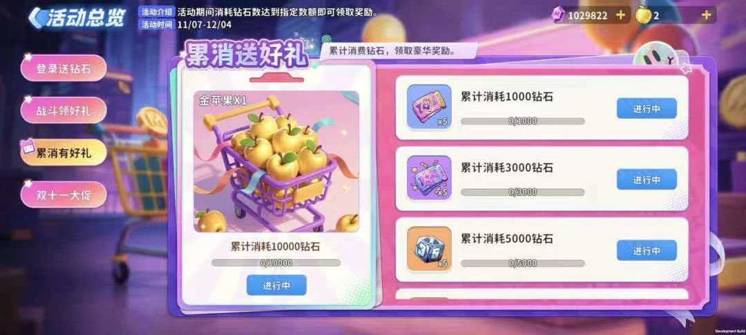 [活动内容]:11月7日-12月4日,累计消费一定数额10000个钻石,可领取获得一个金苹果奖励!