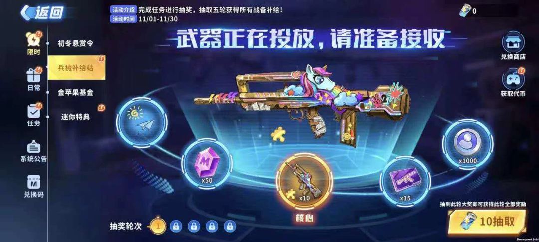 [活动内容]:11月1日-11月30日,兵械补给站第2期将会返场 “纸质雕刻” ,完成任务进行抽奖,抽取五轮获得所有战备补给!