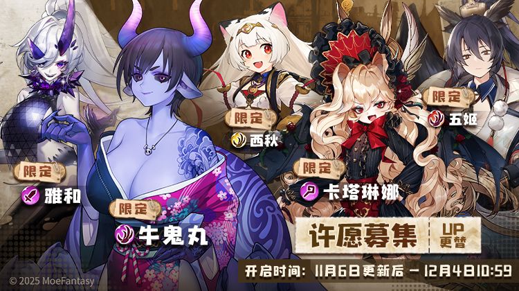 许愿角色:牛鬼丸【限定·new】、五姬【限定】、卡塔琳娜【限定】、雅和【限定】、西秋【限定】