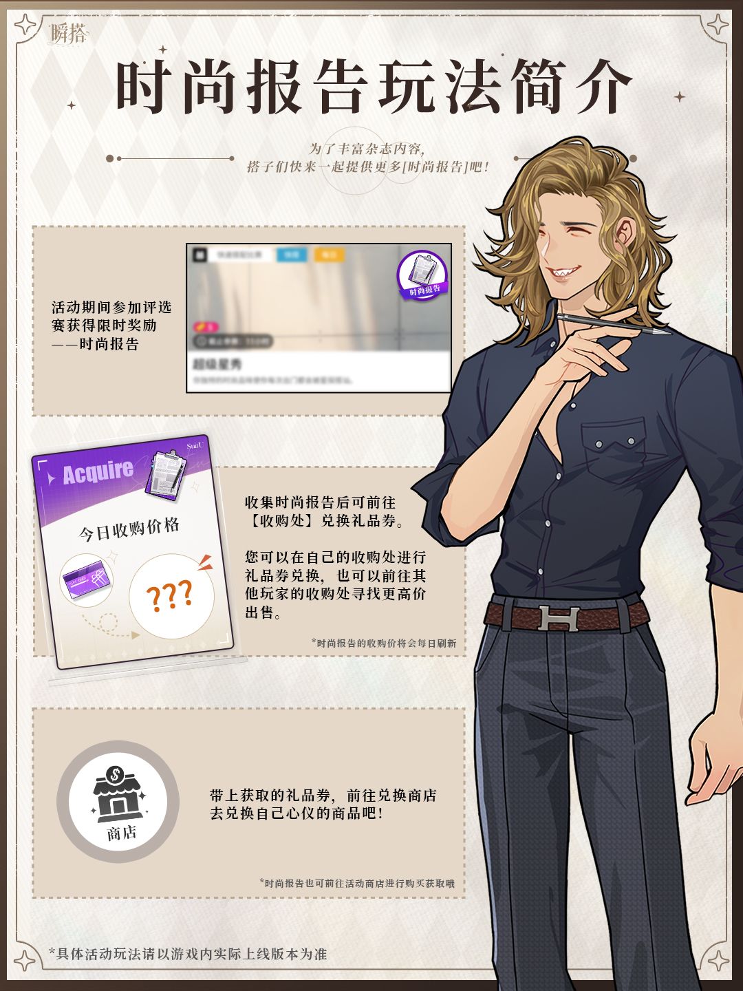 2、收集【时尚报告】后,可前往自己或其他搭子的【收购处】售出,赚取【礼品券】;使用【礼品券】可在活动兑换商店兑换心仪奖励。