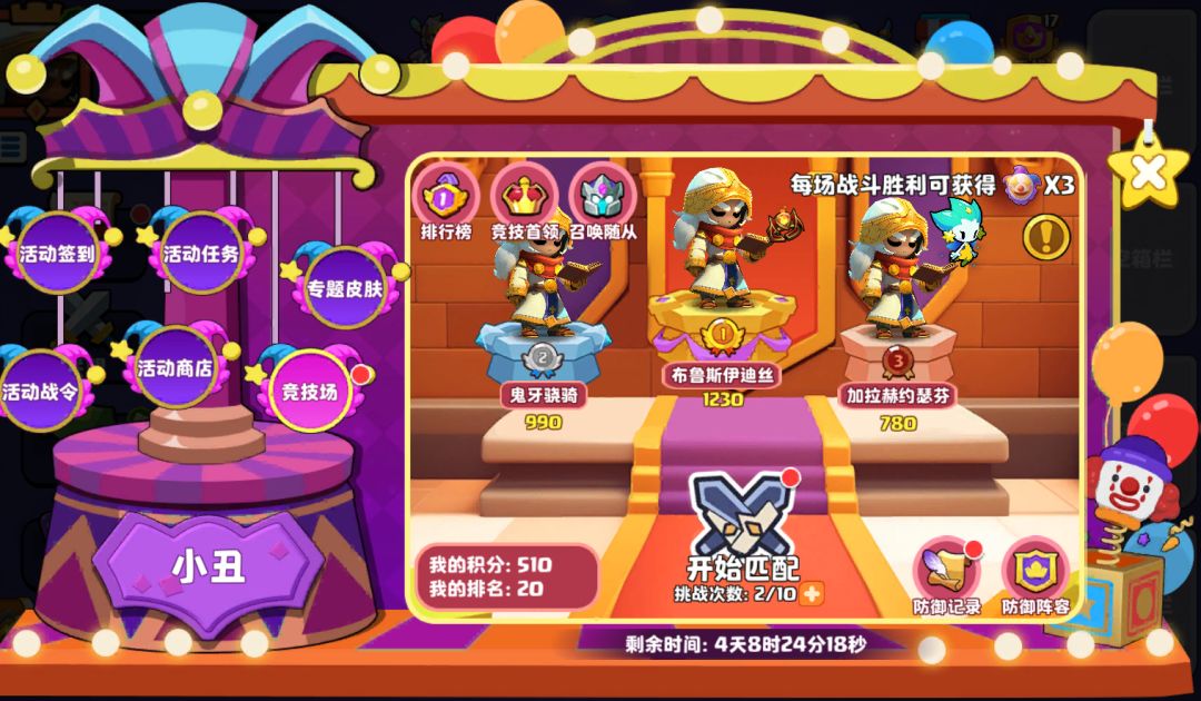 竞技场是我们获得小丑面具的主要来源,一天至多可以获得30个小丑面具,规则是每天可以召唤随机的随从,然后挑选自己喜欢的,进行战前摆放,放置结束后匹配其他对手摆放的阵容就行啦,不需要用到自己的卡组、也不需要操作,简单有趣~如果活动结束时,在排行榜中排名靠前的话,还可以拿到额外的奖励哦!