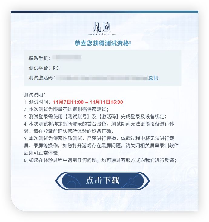海履者在拥有测试资格并完成保密协议签署后,将会在官网资格查询中显示以上查询界面,获得一份32位测试激活码。激活码一号一码,烦请海履者妥善保存该激活码,切勿将激活码分享给他人使用。