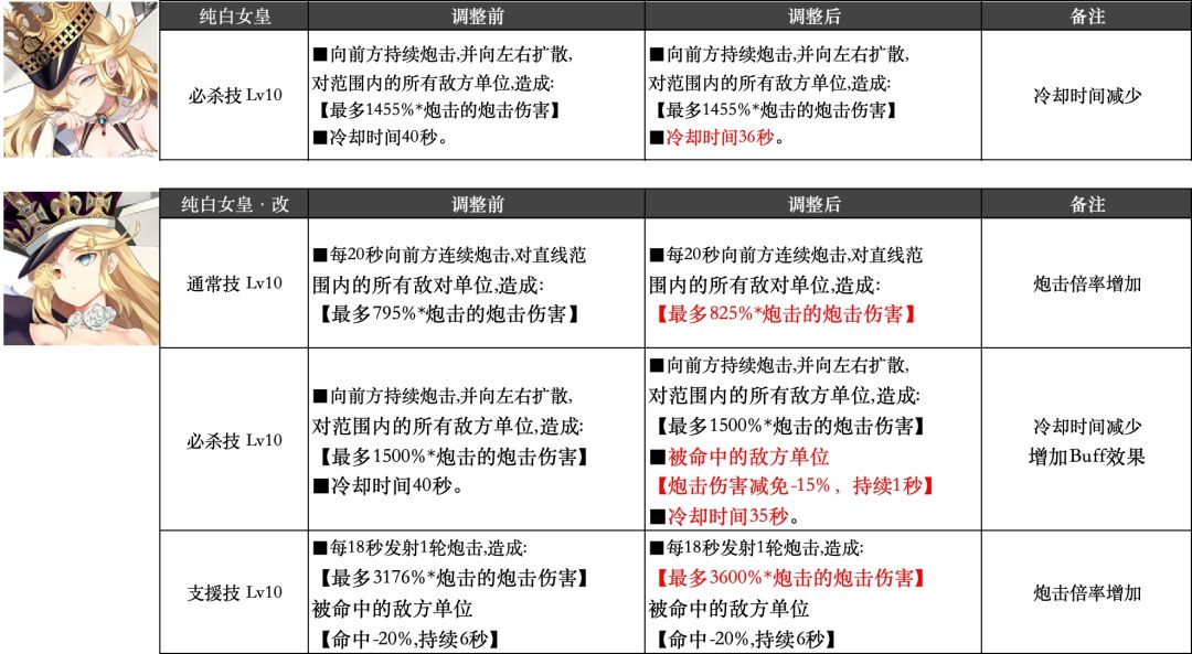 2、舰灵技能优化:对「纯白女皇」「纯白女皇·改」的技能进行了调整优化,具体调整内容请参见下方表格说明: