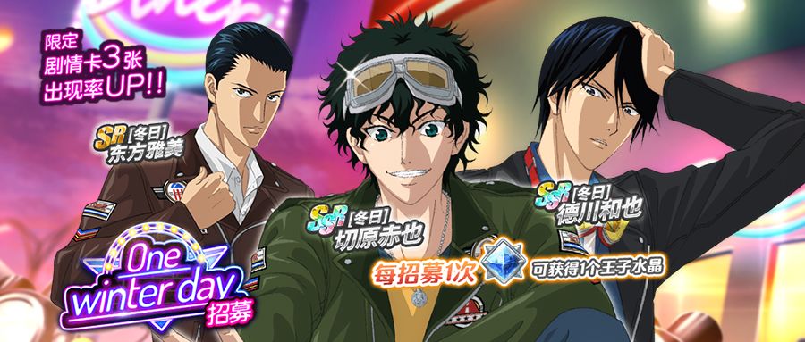 ★在本次招募中,玩家每次招募均可获得王子水晶,王子水晶可在活动交换所内兑换当期限定招募卡:王子水晶*150 可兑换SSR[冬日]切原赤也*1