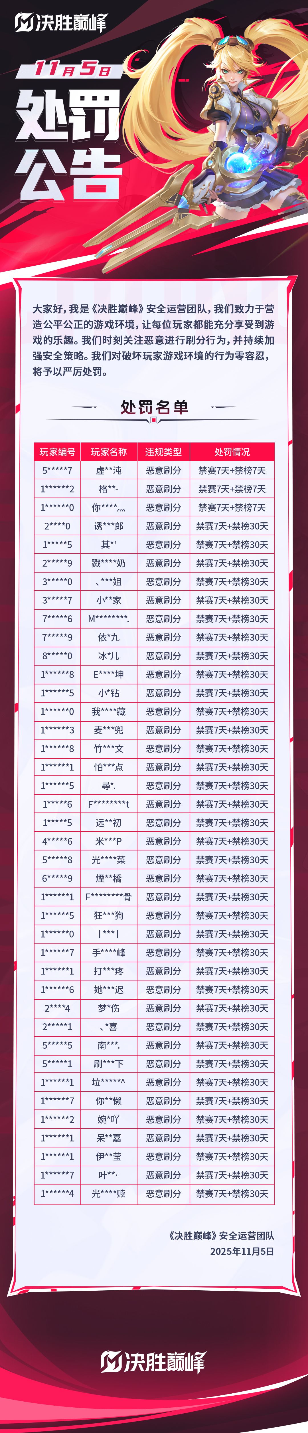 大家好,我是《决胜巅峰》安全运营团队,我们致力于营造公平公正的游戏环境,让每位玩家都能充分享受到游戏的乐趣。我们时刻关注恶意进行刷分行为,并持续加强安全策略。我们对破坏玩家游戏环境的行为零容忍,将予以严厉处罚。