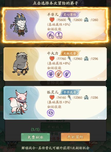 接下来,消耗5点体力点击开始战斗,会出现三个弟子,每个弟子的初始技能不同,弟子的技能数量越多,弟子颜色就越好,橙色是最好的弟子,自身带3个技能, 还可免费刷新一次弟子;