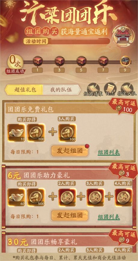 活动期间,掌柜可通过发起组团或加入其他掌柜组团后进行礼包购买,多名掌柜共同购买可获取额外福利奖励~
