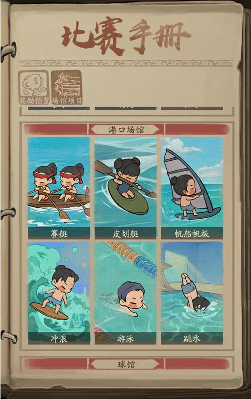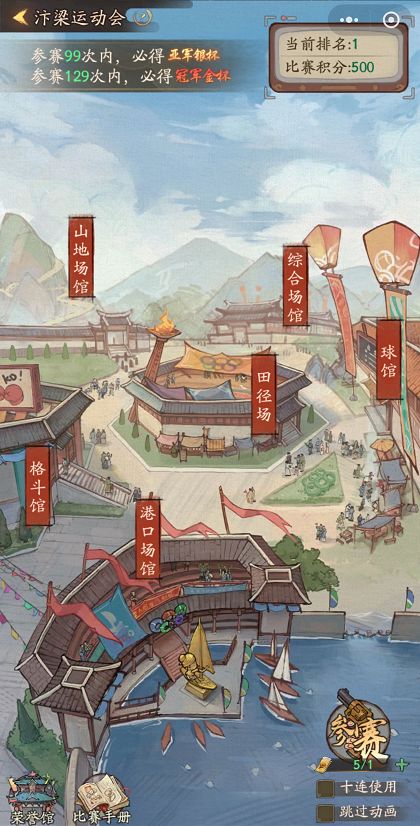 活动开启后,掌柜可前往运动会场,消耗「参赛券」参与比赛,会场内含有6个场馆,每个场馆内含有6个比赛项目。